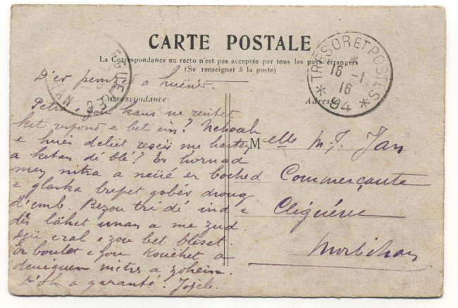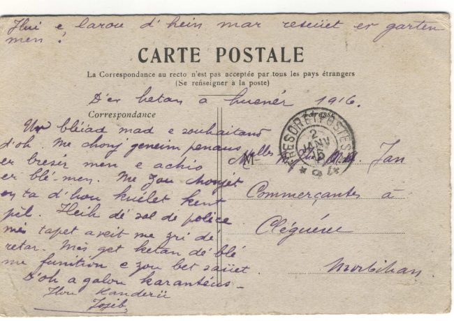 Il écrit de Nomény au nord de Nancy 2 cartes en breton à sa cousine Marie Joseph JAN