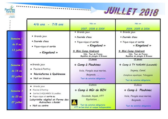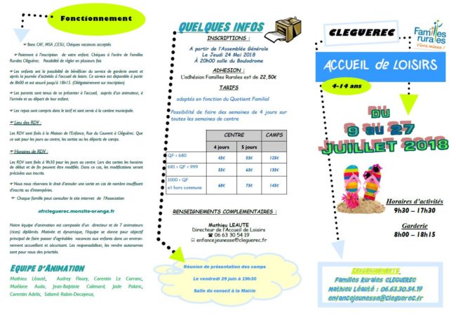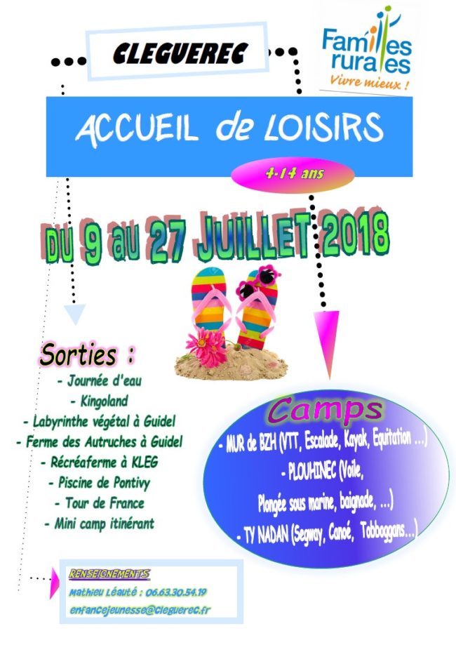 Les inscriptions pour l’accueil de loisirs du mois de Juillet débuteront lors de l’Assemblée Générale de Familles Rurales, le Jeudi 24 Mai à 20h00, au Boulodrome. Ne tardez pas inscrire vos enfants et ados, de 4 à 14 ans !