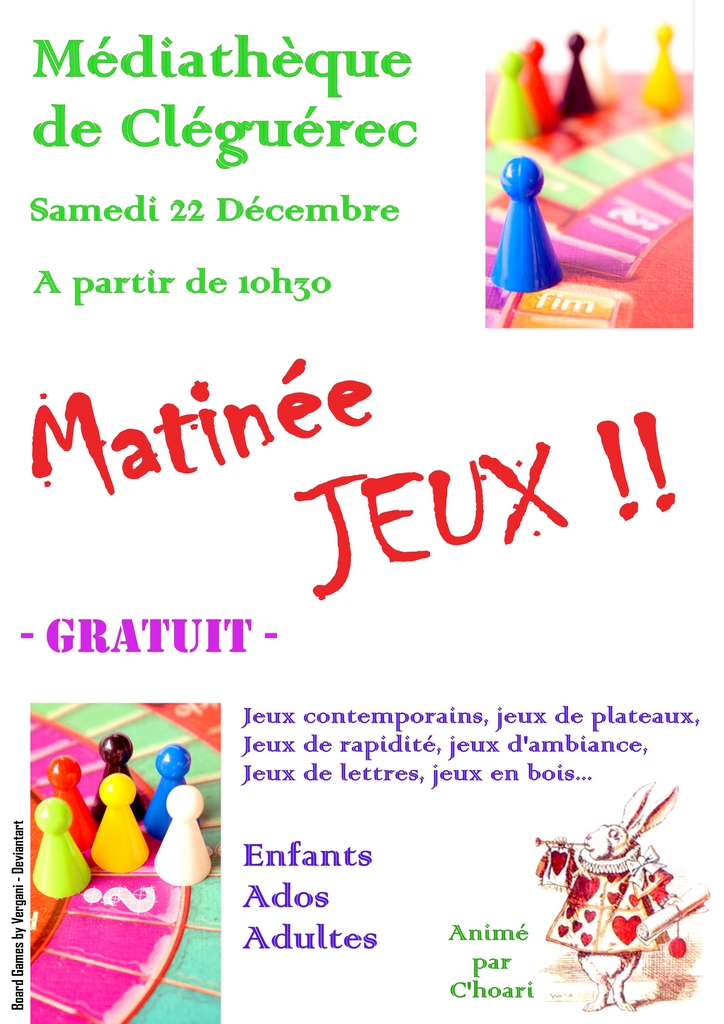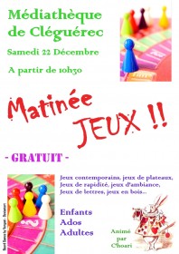 Samedi 22 Décembre à partir de 10h30, la Médiathèque Municipale de Cléguérec organise une nouvelle matinée dédiée au JEU, pour toute la famille !