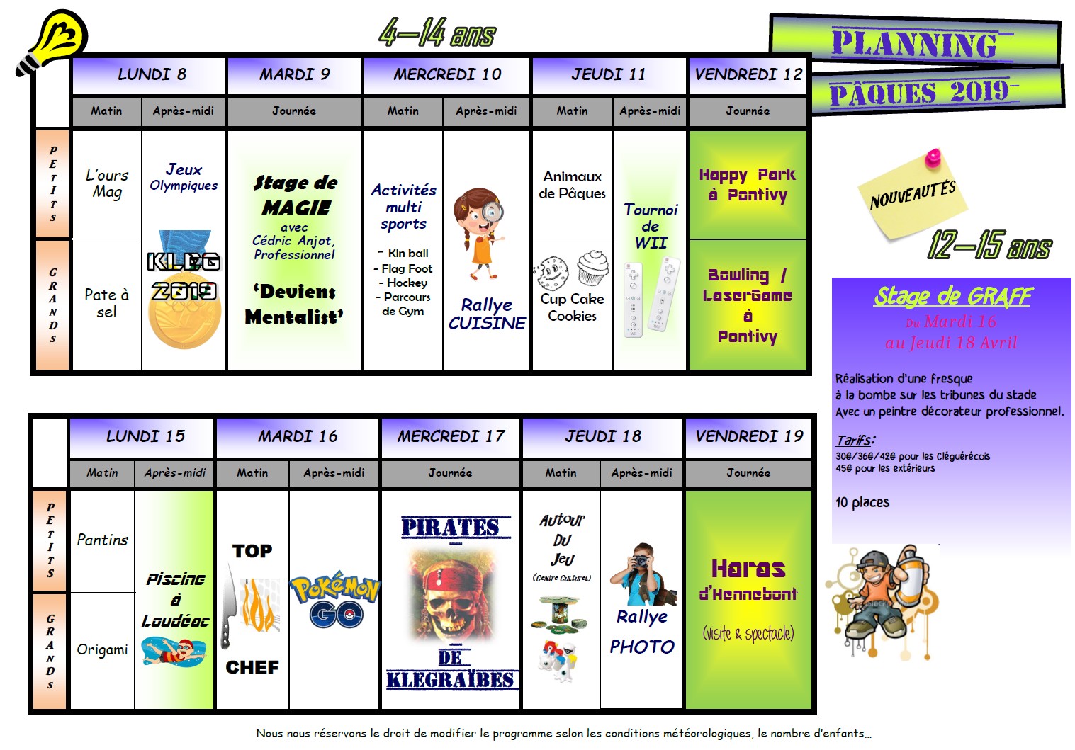 Vous trouverez ci-dessous en téléchargement le nouveau programme de l’Accueil de Loisirs pour les vacances de Printemps 2019.