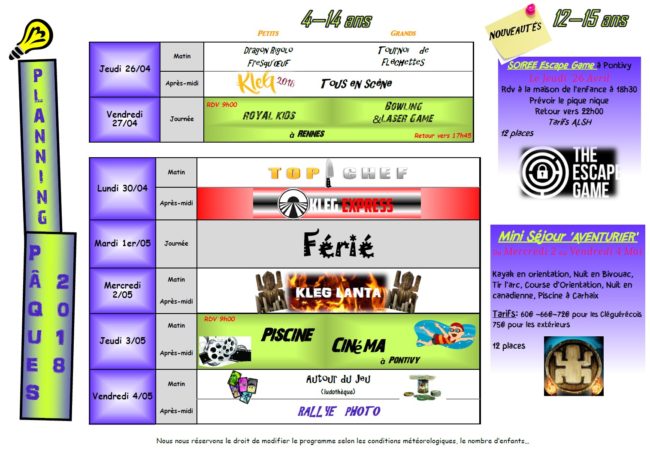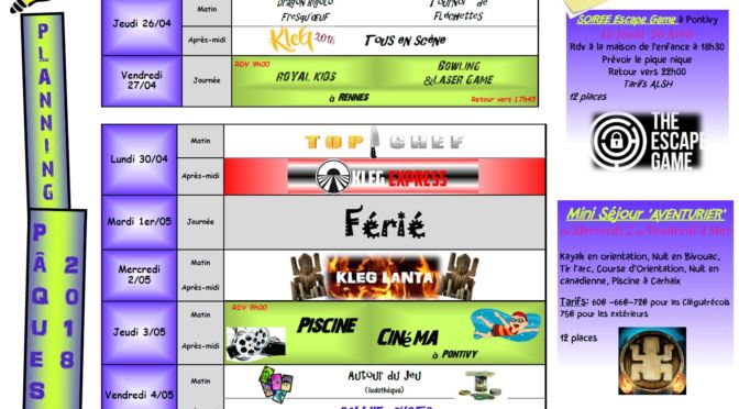 Vous trouverez ci-dessous en téléchargement le nouveau programme de l’Accueil de Loisirs pour les vacances de Printemps 2018.