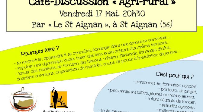 Vendredi 17 Mai ont lieu 5 cafés-discussion sur la thématique agricole, notamment l’installation, sur le Morbihan (secteurs d’Augan, Auray, Melrand, Gourin et Pontivy).