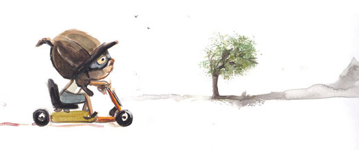 « Toute la journée, Ujène tourne en rond sur sa charrette à pédales. Il tourne en rond autour de sa maman qui le protège et qui sent si bon.