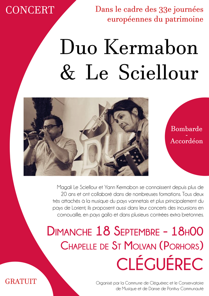Concert organisé dans le cadre des 33e journée européennes du Patrimoine, par la Commune de Cléguérec, le Conservatoire de Musique et de Danse de Pontivy Communauté et le Comité de Chapelle de St Molvan.