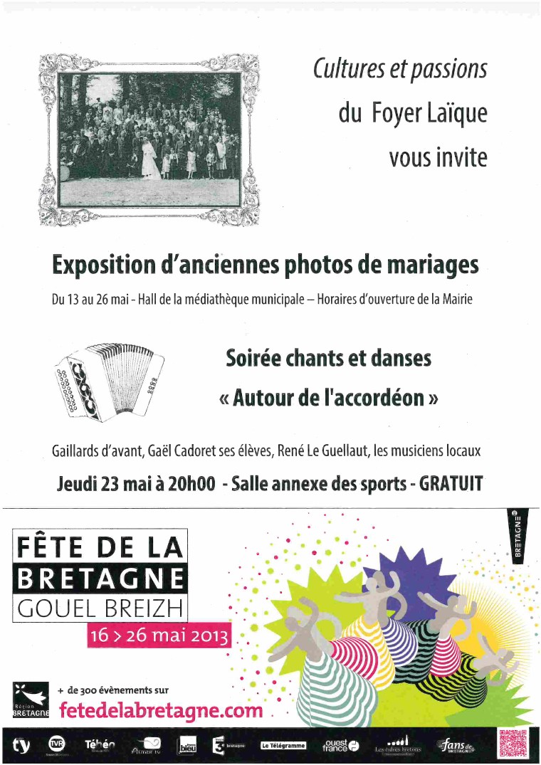 La section « Cultures et Passions » du Foyer Laïque de Cléguérec vous invite à venir découvrir l’exposition « Photos de mariage » du 13 au 26 mai 2013 dans le hall de la Médiathèque de Cléguérec ainsi qu’à la soirée « Autour de l’accordéon » à la salle annexe des sports le jeudi 23 mai à partir de 20h00.