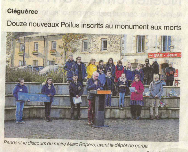 La FNACA avec leurs porte-drapeaux, élus, Maire, pompiers et la présence d’une importante population : une émouvante cérémonie s’est déroulée sur la place puisque douze cléguérecois supplémentaires ont désormais leurs noms inscrits dans le marbre sur le MONUMENT AUX MORTS de la Commune.