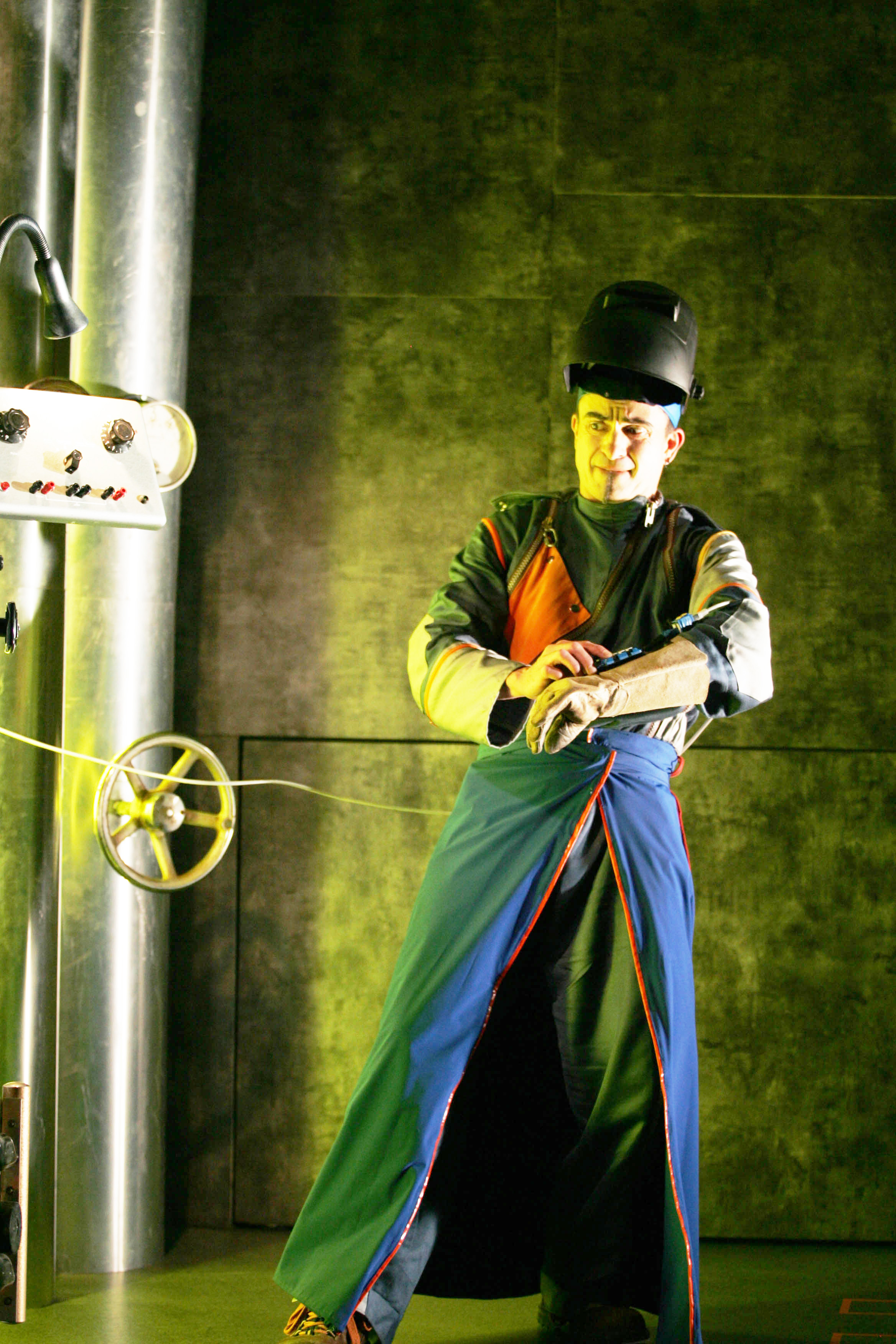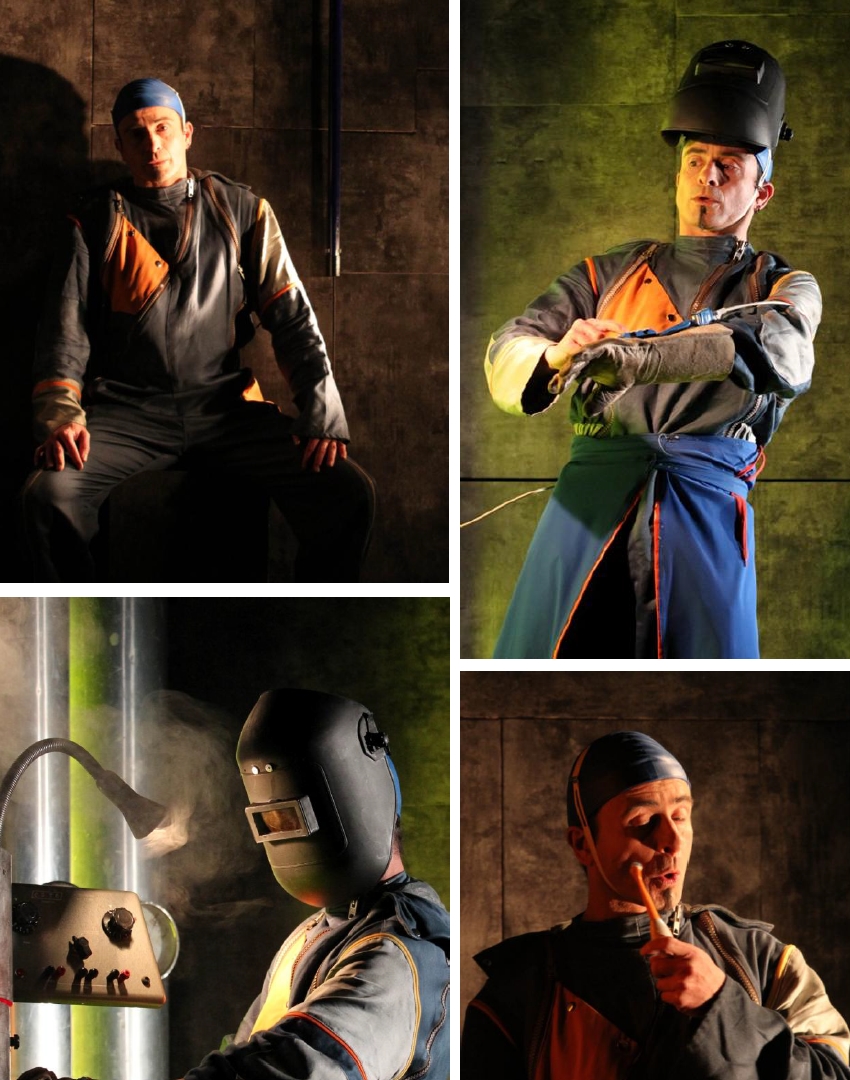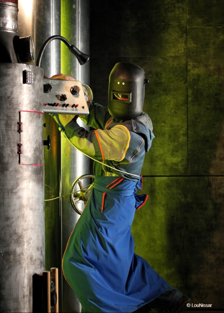 Lazare me rappelle parfois des moments vécus en usine, où j’ai travaillé, regardant les blouses blanches cohabiter avec les bleus de travail, sans jamais vraiment se rencontrer. Chacun sa case… Système de machines aliénantes, environnement réglementé…et pourtant, si l’on s’autorise à être un peu rêveur, fou, créateur, il s’en dégage une beauté des sons, des ferrailles, des robots semblables à des marionnettes, des hommes-machines intrigants et théâtraux… »