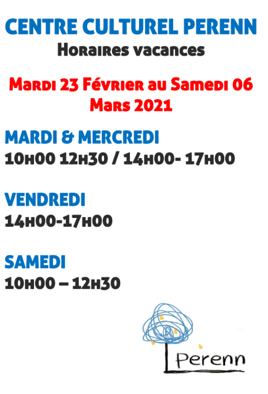 17 février 2021 582 × 855 HORAIRES VACANCES | DU 23 FEV AU 06 MARS | CENTRE CULTUREL PERENN