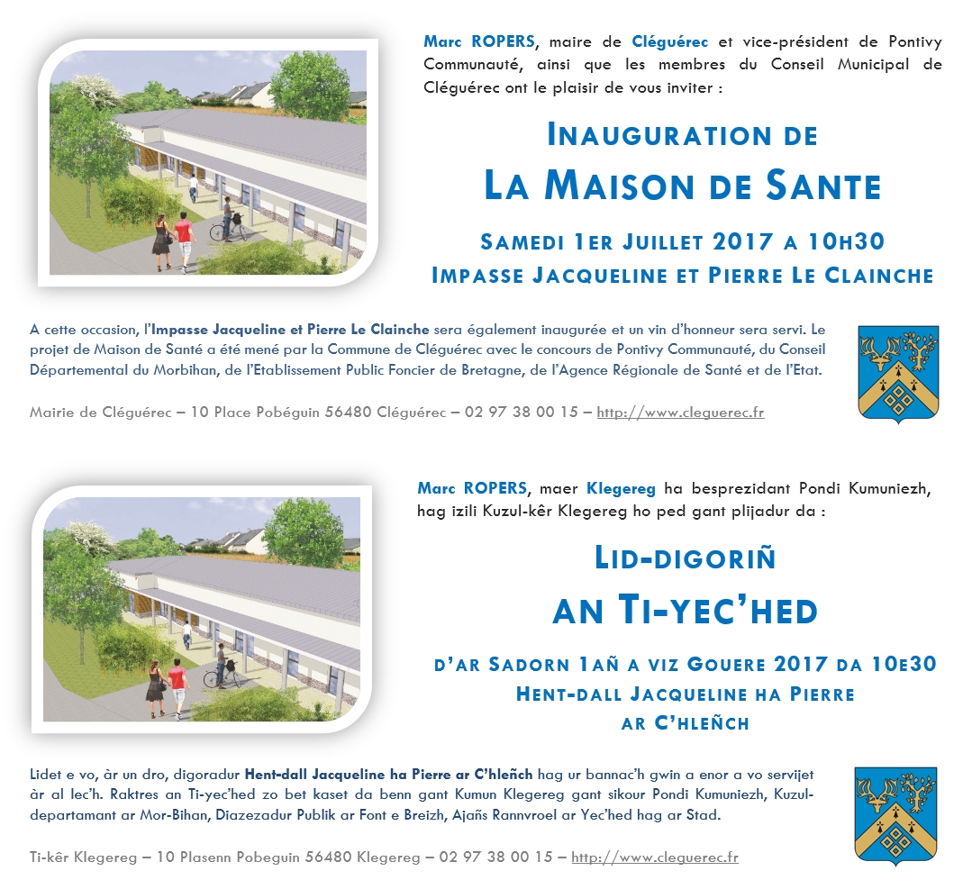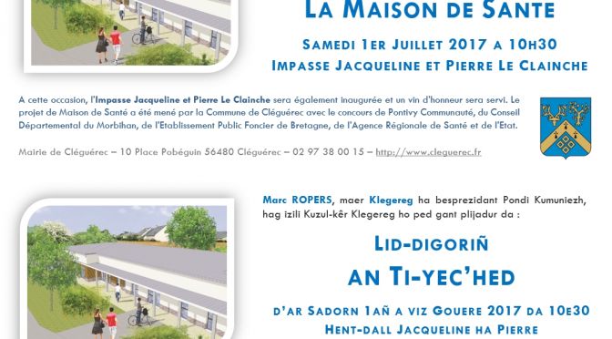 A cette occasion, l’Impasse Jacqueline et Pierre Le Clainche sera également inaugurée et un vin d’honneur sera servi. Le projet de Maison de Santé a été mené par la Commune de Cléguérec avec le concours de Pontivy Communauté, du Conseil Départemental du Morbihan, de l’Etablissement Public Foncier de Bretagne, de l’Agence Régionale de Santé et de l’Etat.