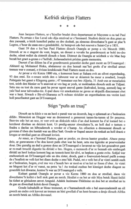 • Texte en Breton : KEFRIDI SKRIJUS FLATTERS / Testenn e brezhoneg