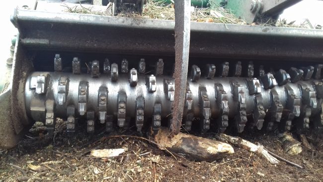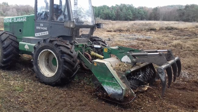 Aujourd’hui 29 novembre 2017, nous faisons réaliser le broyage et l’arasage des souches sur une surface de 1,5 hectare, suite à l’abattage des pins maritimes effectué en 2015. Cette opération est rendue possible grace aux nouveaux moyens attribués par le département du Morbihan.