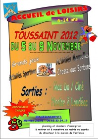 Vous trouverez ci-dessous en téléchargement (PDF) le programme des activités de l’Accueil de Loisirs pour les vacances de la Toussaint 2012.
