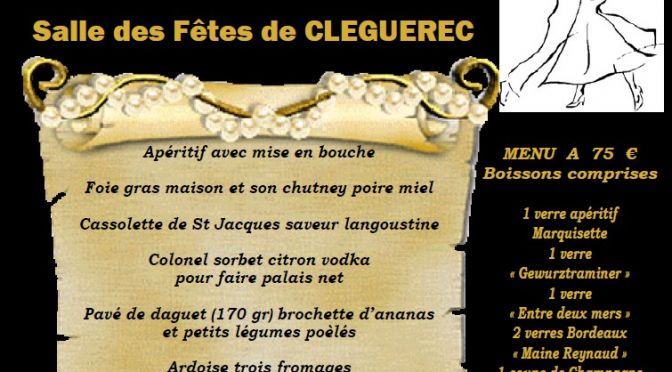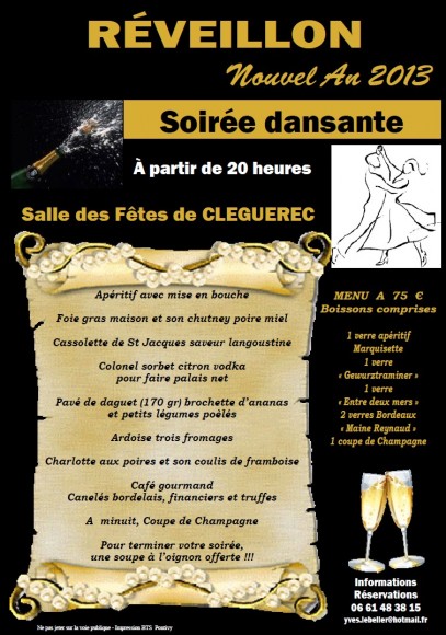 Le 31 Décembre sont organisés un repas et une soirée dansante à partir de 20h00 à la Salle des Fêtes de Cléguérec. Cliquez sur l’image ci-dessous pour plus d’informations !