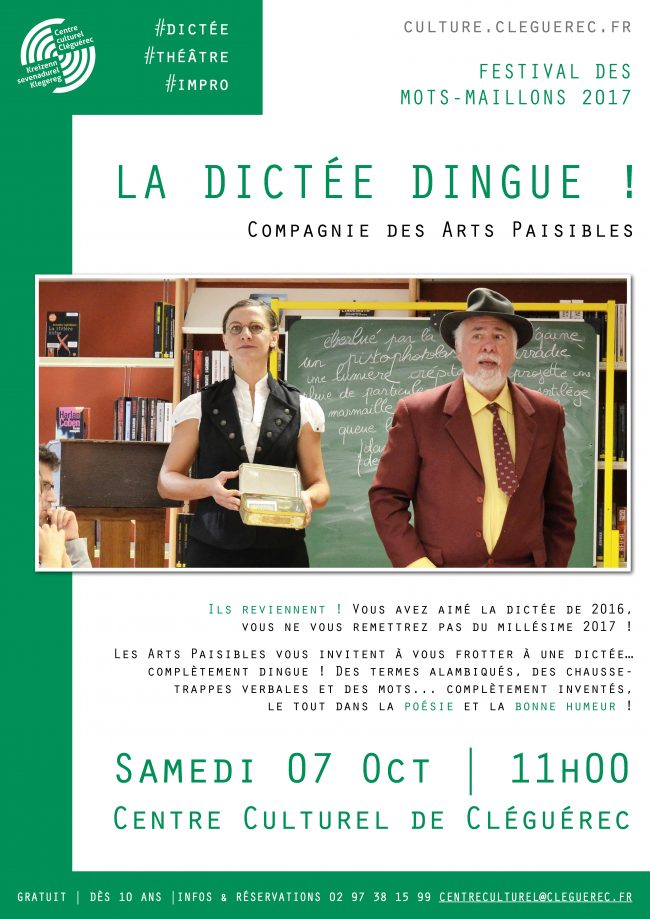 Les Arts Paisibles vous invitent à venir vous amuser d’une dictée… complètement dingue ! Des termes alambiqués, des chausse-trappes verbales, et même des mots complètement inventés, dont il sera naturellement difficile de deviner l’orthographe exacte… le tout dans la poésie et la bonne humeur ! Ambiance studieuse… non-garantie !