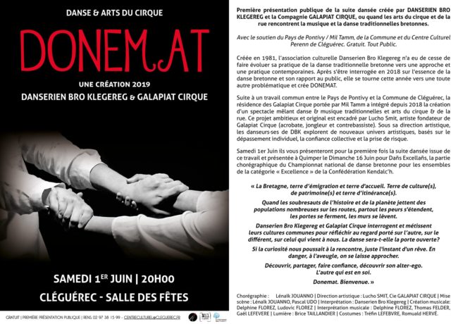 Venez assister à la première présentation publique (2 x 20min.) de la suite dansée créée par DANSERIEN BRO KLEGEREG sous la direction artistique de Lucho Smit, de la Compagnie GALAPIAT CIRQUE, ou quand les arts du cirque et de la rue rencontrent la musique et la danse traditionnelles bretonnes.