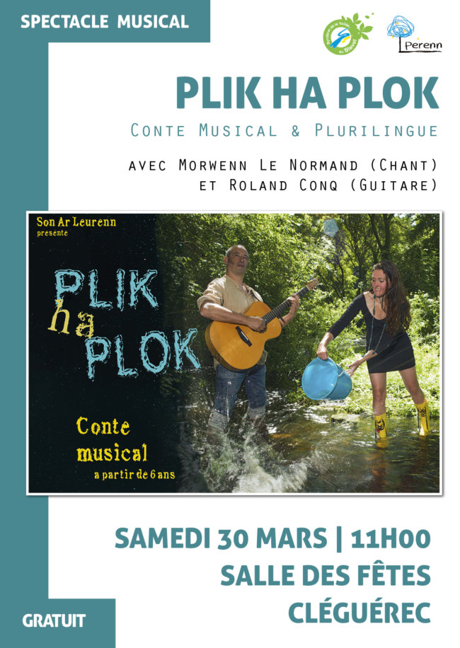| Spectacle musical & plurilingue De et avec Morwenn Le Normand (chant) et Roland Conq (guitare) Dans le cadre de la semaine « Le Blavet au Naturel 2019 » proposée par le Syndicat de la Vallée du Blavet Gratuit | Réservations (conseillées) au 02 97 38 15 99 ou sur centreculturel@cleguerec.fr « Plik ! » son des clapotis, gouttelettes et jaillissements. « Plok ! » récit musical éclaboussant de poésie et d’humour… « Plik ha Plok », merveilleuse balade musicale au cœur de l’eau ! La vie d’une rivière n’est pas toujours simple. De sa source à la mer, ses problématiques sont nombreuses. L’eau, notre bien commun, nous pousse à réfléchir sur la force de la nature et le respect qu’elle nous impose. L’eau, source véritable de vie sur terre, doit cohabiter avec l’homme qui se nourrit, se lave, boit. L’homme qui la souille, l’homme qui la nettoie. Une chanteuse polyglotte et un musicien frotteur de cordes vont vous conter la rivière, celle qu’ils connaissent bien en Bretagne. Ils interpelleront Mami Wata, déesse protectrice du fleuve Nakambé en Afrique, chanteront la beauté de la Dobra des Asturies. L’eau est une histoire universelle et où que l’on soit dans le monde, elle est source de vie et source d’émotions… « A travers cette nouvelle création « Plik Ha Plok », nous avons eu l’envie de sensibiliser le jeune public aux enjeux humains, culturels et environnementaux de notre époque et de leur avenir. Nous considérons que les chants populaires, la diversité des cultures et la préservation de l’environnement sont des thèmes très étroitement liés et nous avons placé l’Eau, bien commun universel, au cœur de ce spectacle. Nous faisons clapoter cette eau en la faisant murmurer, chanter ou crier en différentes langues, creusant ainsi un chemin entre plusieurs pays et régions (Occitanie, Corse, Bretagne, Asturies, Burkina Faso, etc…) dans ce que lui les distingue comme dans ce qui les unit. Nous avons écrit un spectacle qui parle aux enfants de tous lieux et de toutes origines. D’un bord, la musicalité de l’eau, des langues et des chants traditionnels et de l’autre, les problématiques environnementales et les attitudes positives à adopter, au confluent de l’humour et de la poésie. » Morwenn Le Normand et Roland Conq |