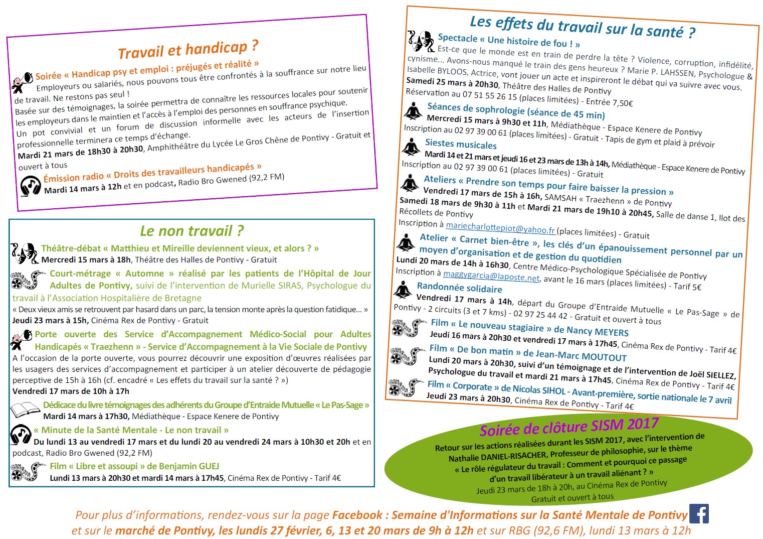 Du 13 au 26 Mars, le réseau Pontivien des Semaines d’Informations sur la Santé Mentalevous propose deux semaines chargées d’événements pour apprendre, réfléchir, se sentir moins seul face à ses difficultés, remettre en question ses propres ​préjugés.