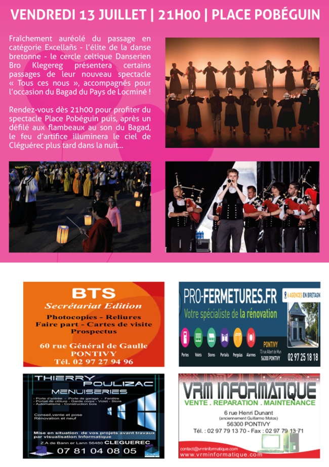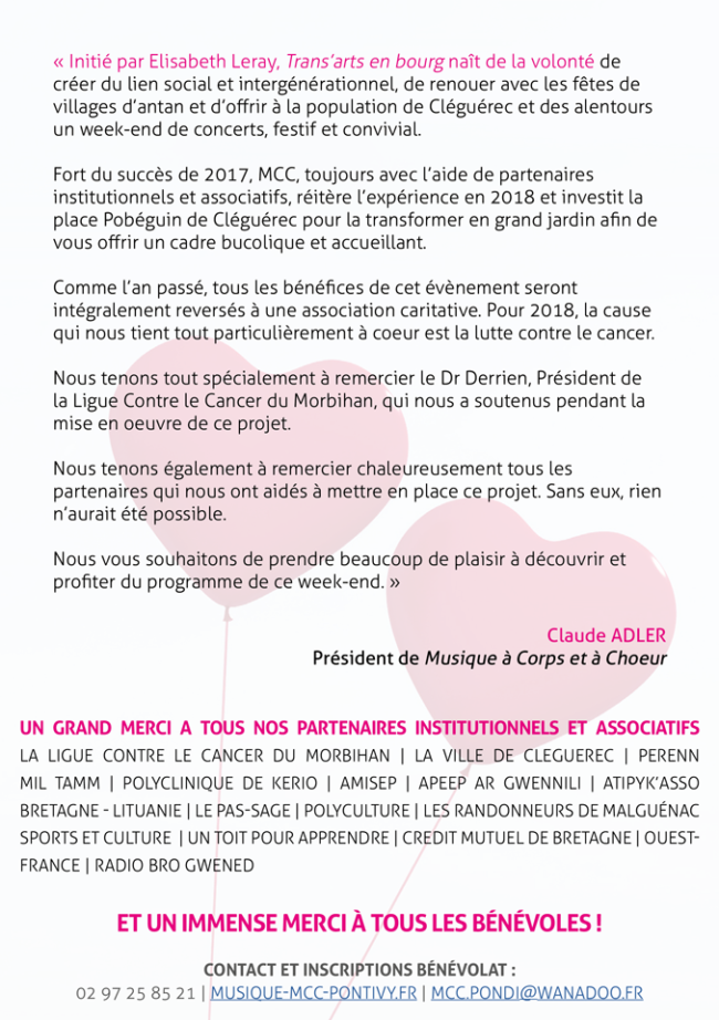 Co-organisé par l’association Musique à Corps et à Chœur et ses nombreux partenaires associatifs, privés et institutionnels, dont la Commune et le Centre Culturel Perenn de Cléguérec.