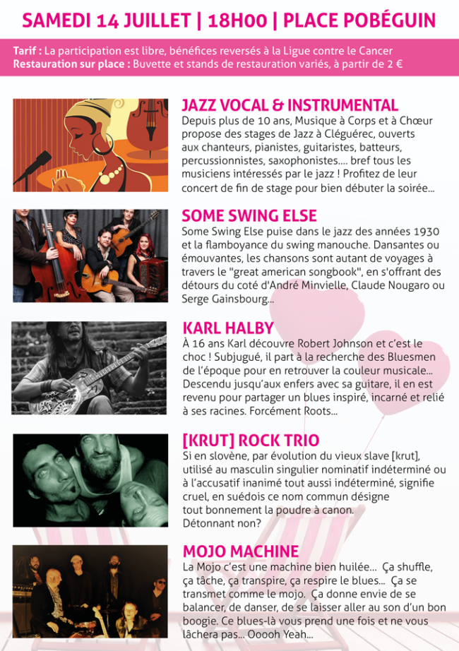 Un grand week-end festif et convivial, avec notamment la Mojo Machine, Krut, Some Swing Else, Bob et Flanaghan, Mark Keen Trio, Karl Halby, L’Internationale Poullaouennaise, Danserien Bro Klegereg & Le Bagade de Locminé…