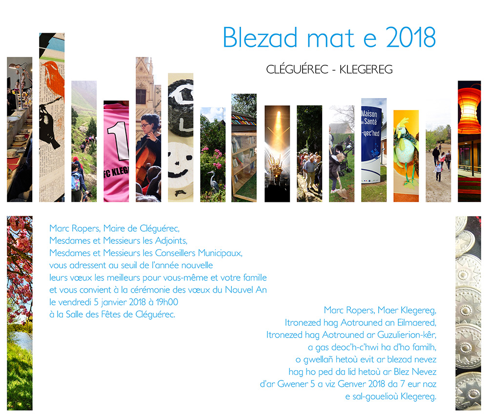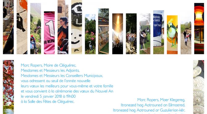 Les vœux du Maire aux cléguérecois(es) pour la nouvelle année 2018 auront lieu le vendredi 05 janvier 2018, à 19h00, à la salle des fêtes de Cléguérec.