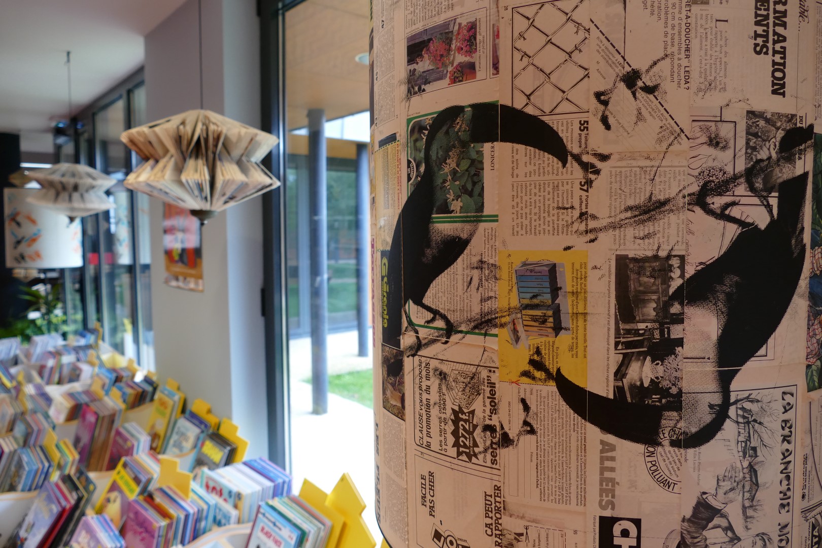 Installation « Aux détours des pages ». Seconde éclosion d’un livre. Un mur immense, une bibliothèque de bouquins oubliés, abimés, à trier, voire à jeter. Page après page, inlassablement, des heures de plis, des plis à toute heure, jusqu’à pas d’heure. C’est alors la naissance d’une deuxième vie, pour ces dinosaures des cartons, la chance de prendre l’air, telle une graine qui germe.