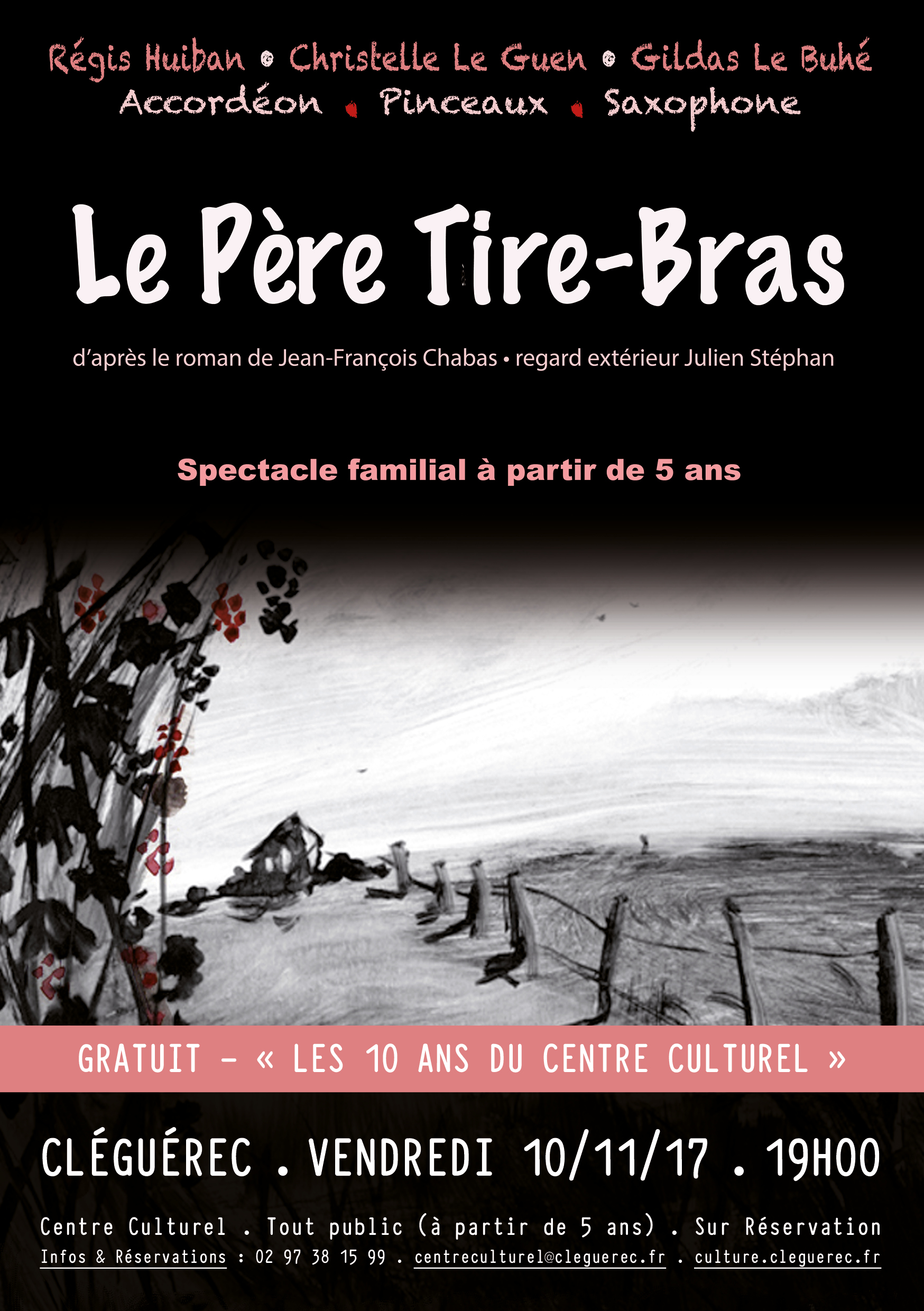 Dès 19h00, nous aurons le plaisir d’accueillir le spectacle Le Père Tire-Bras de la Famille Petit-Plus, un très beau spectacle d’illustration musicale pour petits et grands, dès 4-5 ans. Une très belle histoire dessinée sous vos yeux et en musique par Christelle Le Guen, Gildas Le Buhé et Régis Huiban. Un très beau moment à ne pas manquer alors réservez vite vos places car il n’y en aura peut-être pas pour tout le monde !