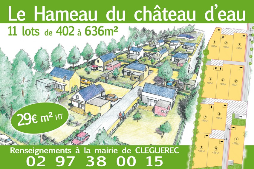 La commune de Cléguérec vous propose plusieurs lots dans le nouveau lotissement « Le Hameau du château d’eau ». Il reste au 25/02/2017 : 9 LOTS de 402 à 637 m², au prix de 33.60 € TTC le m²